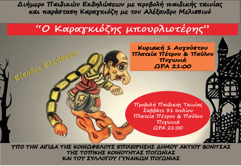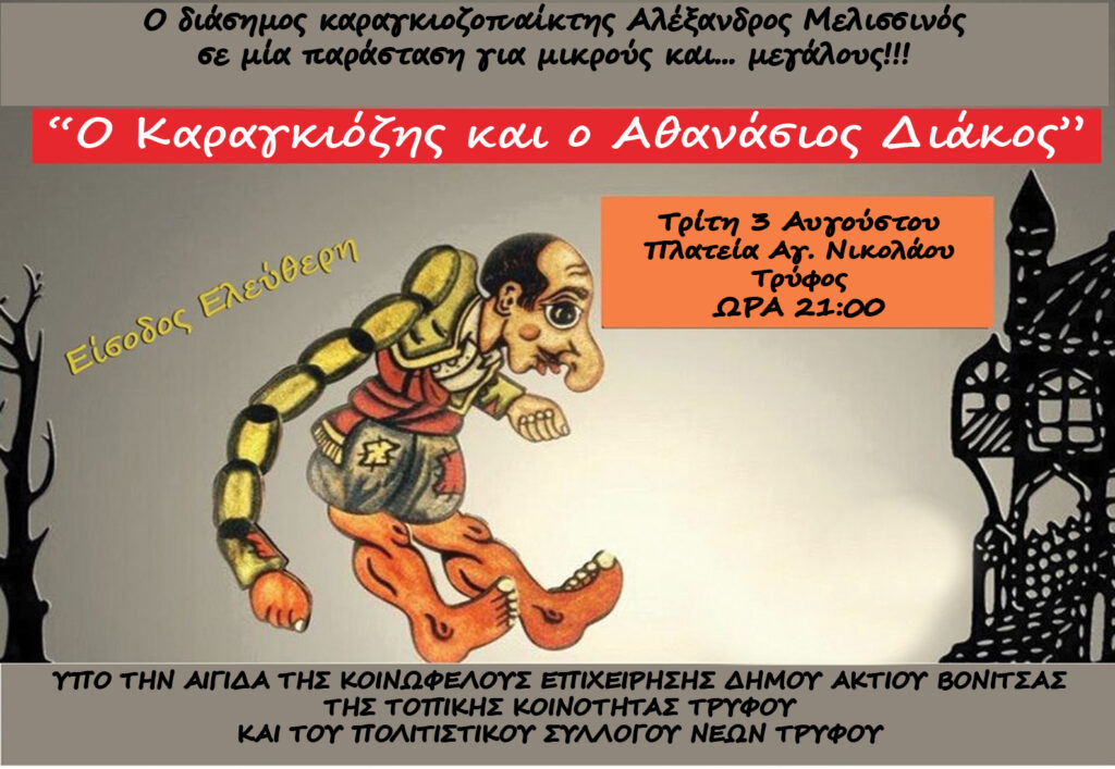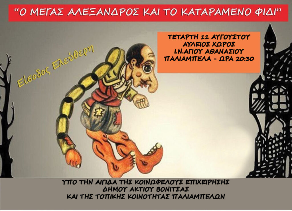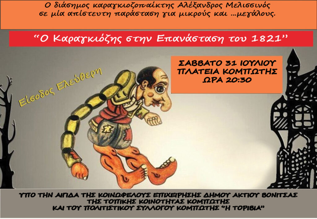 Ο διάσημος Καραγκιοζοπαίχτης Αλέξανδρος Μελισσινός έρχεται με 6 παραστάσεις θεάτρου σκιών και με ήρωα τον Καραγκιόζη στον Δήμο Ακτίου Βόνιτσας .