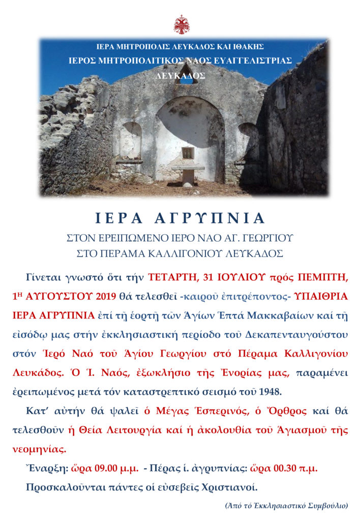 ΑΝΑΚΟΙΝΩΣΕΙΣ - ΔΕΛΤΙΑ ΤΥΠΟΥΤΟΠΙΚΑ ΝΕΑ Αγρυπνία στον Άγιο Γεώργιο στο Πέραμα Καλλιγονίου Λευκάδος Από admin - 27 Ιουλίου 2019 0 1344 FacebookTwitterPinterestWhatsApp