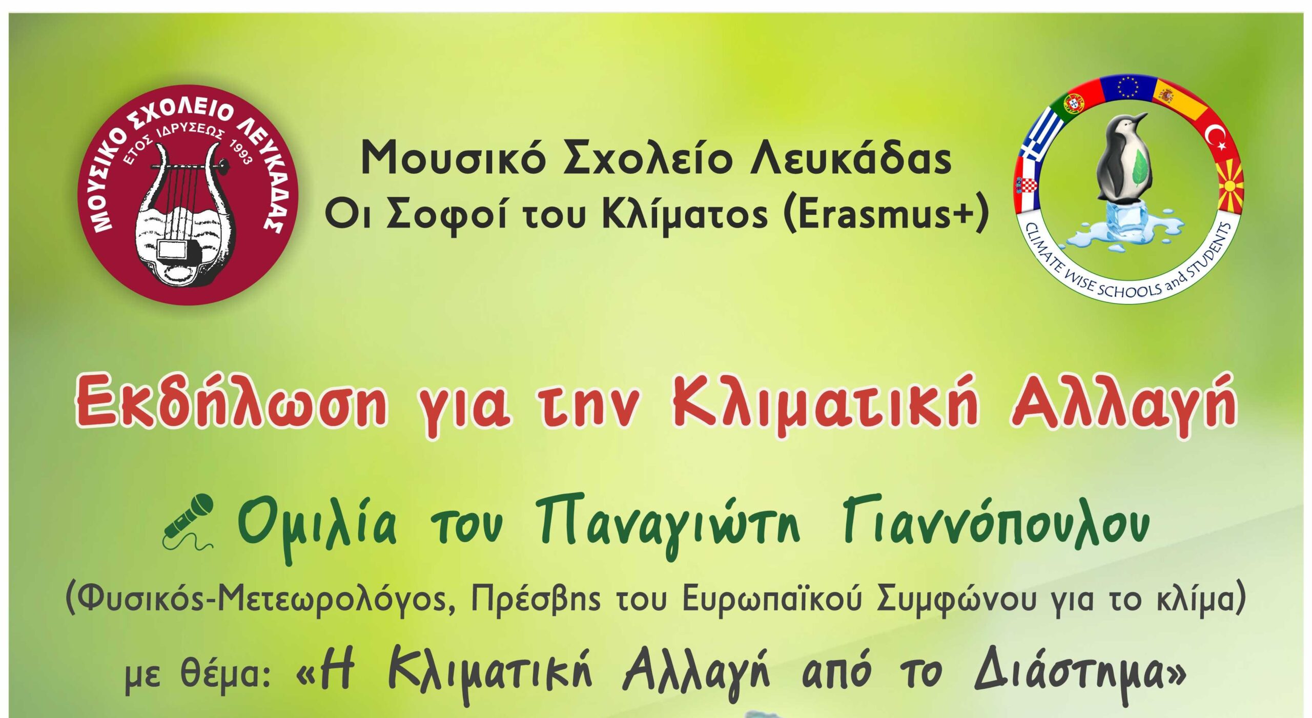 Το Μουσικό Σχολείο Λευκάδας και οι “Σοφοί του Κλίματος” (Erasmus +) σας προσκαλούν σε εκδήλωση για την Κλιματική Αλλαγή. Η εκδήλωση περιλαμβάνει ομιλία του διακεκριμένου επιστήμονα- μετεωρολόγου κ. Παναγιώτη Γιαννόπουλου. Η ομιλία θα πλαισιωθεί με την παρουσίαση μιούζικαλ.