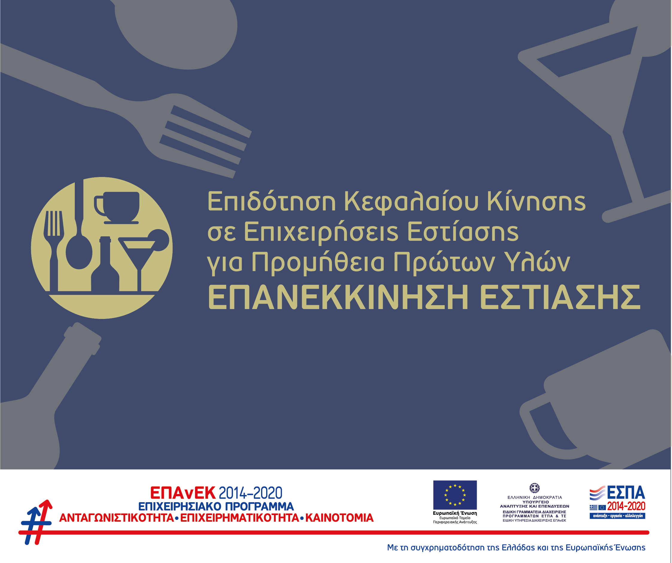 Η Δράση στοχεύει στην επιχορήγηση ΜμΕ και Μεγάλων Επιχειρήσεων του κλάδου της εστίασης για τη στήριξη μετά την επανεκκίνηση της λειτουργίας τους, υπό το καθεστώς της πανδημίας της νόσου COVID-19, με την προμήθεια πρώτων υλών απαραίτητων για τη λειτουργία τους.