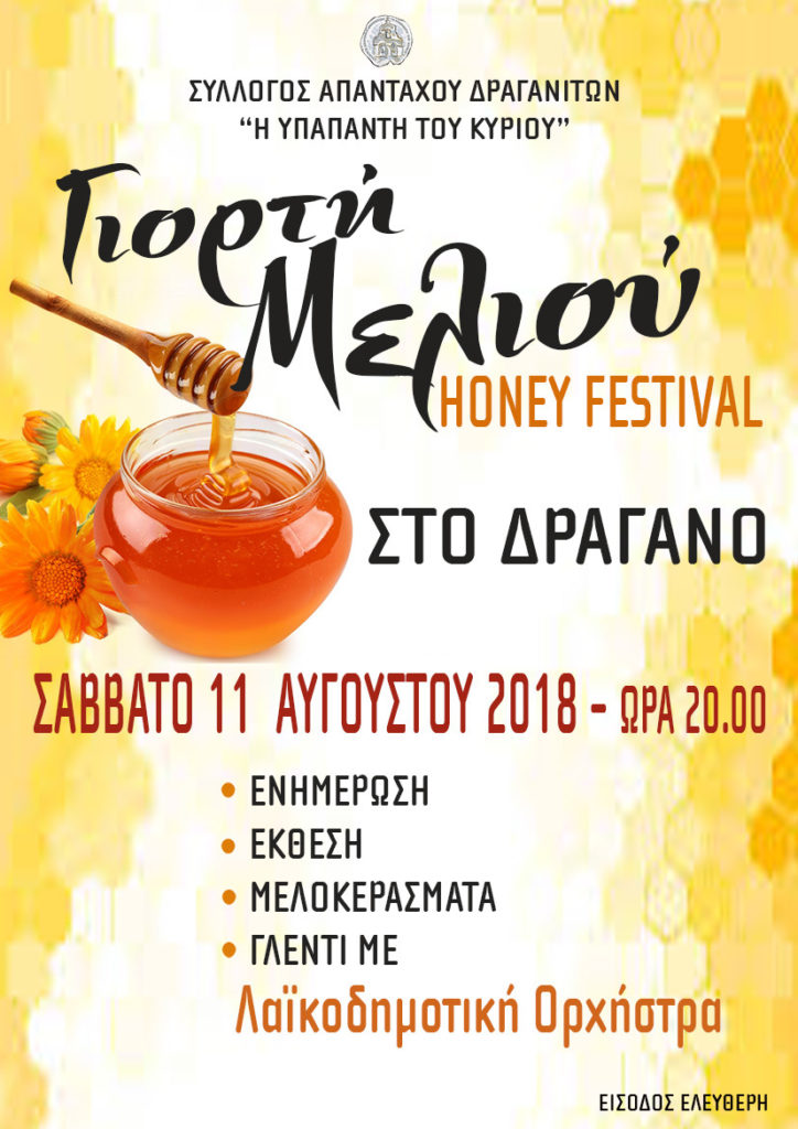Ο Σύλλογος Απανταχού Δραγανιτών «Η Υπαπαντή του Κυρίου» διοργανώνει τη Γιορτή Μελιού 2018 στο Δράγανο το Σάββατο 11 Αυγούστου, ώρα 8:00 μμ.