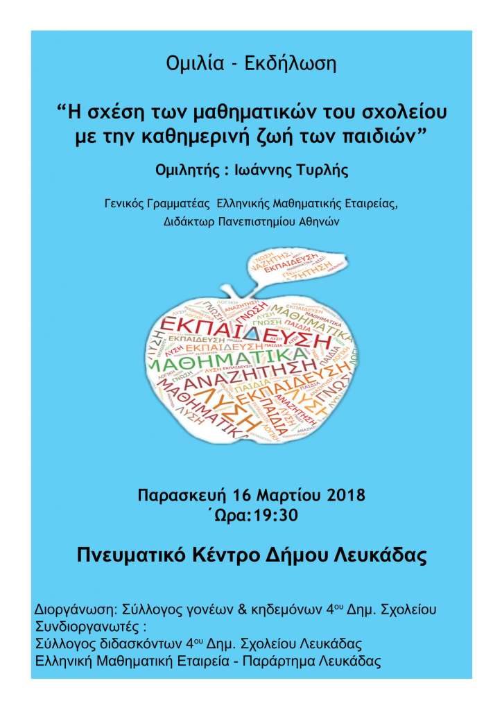 Μια ενδιαφέρουσα εκδήλωση – ομιλία διοργανώνει ο σύλλογος γονέων και κηδεμόνων 4ου Δημοτικού σχολείου Λευκάδας με τίτλο ¨Η σχέση των μαθηματικών του σχολείου με την καθημερινή ζωή των παιδιών” σε συνδιοργάνωση με τον σύλλογο διδασκόντων 4ου Δημοτικού σχολείου και την Ελληνική Μαθηματική Εταιρεία- Παράρτημα Λευκάδας .