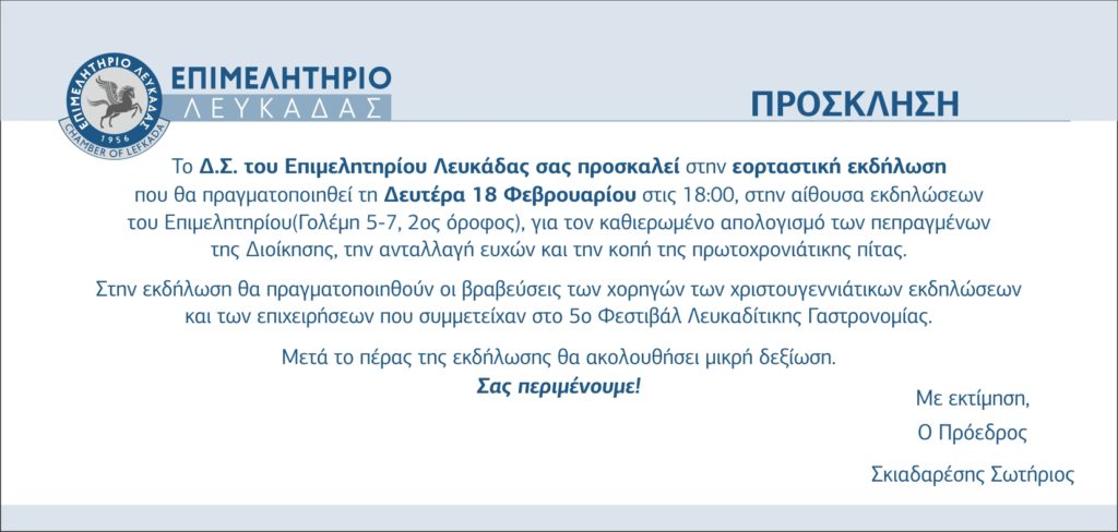 ΠΟΛΙΤΙΣΜΟΣΤΟΠΙΚΑ ΝΕΑ Κοπή πίτας Επιμελητηρίου Λευκάδας Από admin - 16 Φεβρουαρίου 2019 0 1201 FacebookTwitterPinterestWhatsApp Την Δευτέρα 18 Φεβρουαρίου θα πραγματοποιηθεί εκδήλωση για την κοπή της πρωτοχρονιάτικης πίτας του επιμελητρίου Λευκάδας καθώς και ο απολογισμός της Διοίκησης.