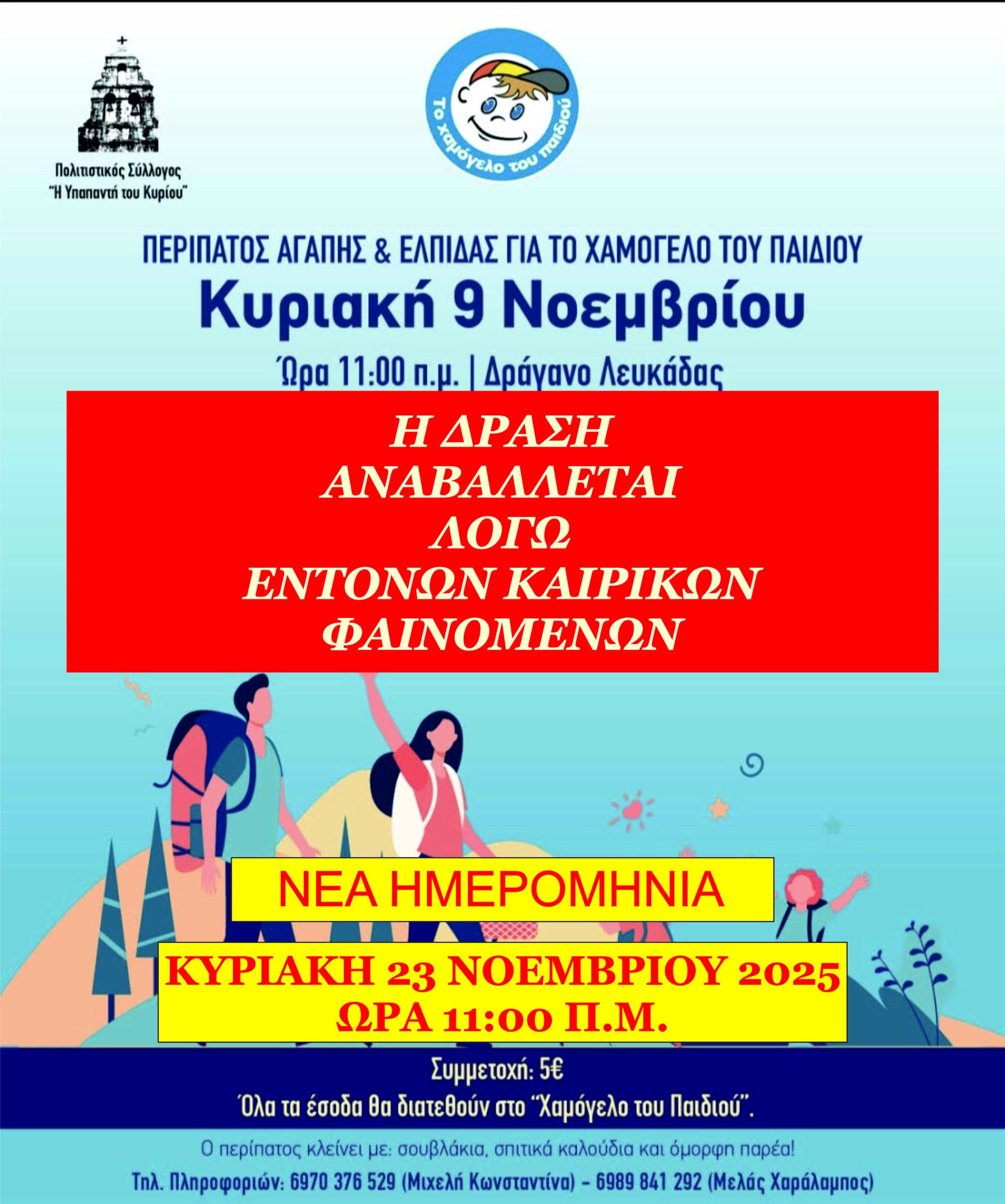 ο προγραμματισμένος Φιλανθρωπικός Ορεινός Περίπατος της Κυριακής 9 Νοεμβρίου 2025 αναβάλλεται για λόγους ασφάλειας και καλύτερης διεξαγωγής της δράσης.