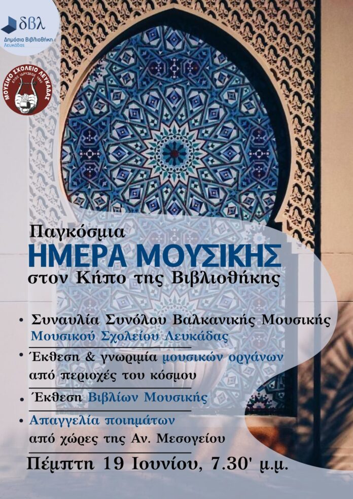 ΠΟΛΙΤΙΣΜΟΣ ΠΑΓΚΟΣΜΙΑ ΗΜΕΡΑ ΜΟΥΣΙΚΗΣ ΣΤΗ ΔΗΜ. ΒΙΒΛΙΟΘΗΚΗ ΛΕΥΚΑΔΑΣ Από admin - 18 Ιουνίου 2025 0 366 FacebookTwitterPinterestWhatsApp Σας προσκαλούμε στην εκδήλωση για την Παγκόσμια Ημέρα Μουσικής την Πέμπτη 19/6/2025, 7.30΄στον κήπο της Βιβλιοθήκης