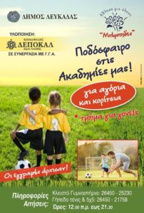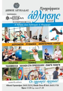 Άρχισαν οι εγγραφές στα προγράμματα μαζικού αθλητισμού του Δήμου Λευκάδας «ΑΘΛΗΣΗ για ΟΛΟΥΣ», περιόδου 2017-2018, που υλοποιεί η Δημοτική Κοινωφελής Επιχείρηση ΔΕΠΟΚΑΛ με τη συνεργασία της Γενικής Γραμματείας Αθλητισμού σε Δημοτικές και Τοπικές Κοινότητες του Δήμου μας.