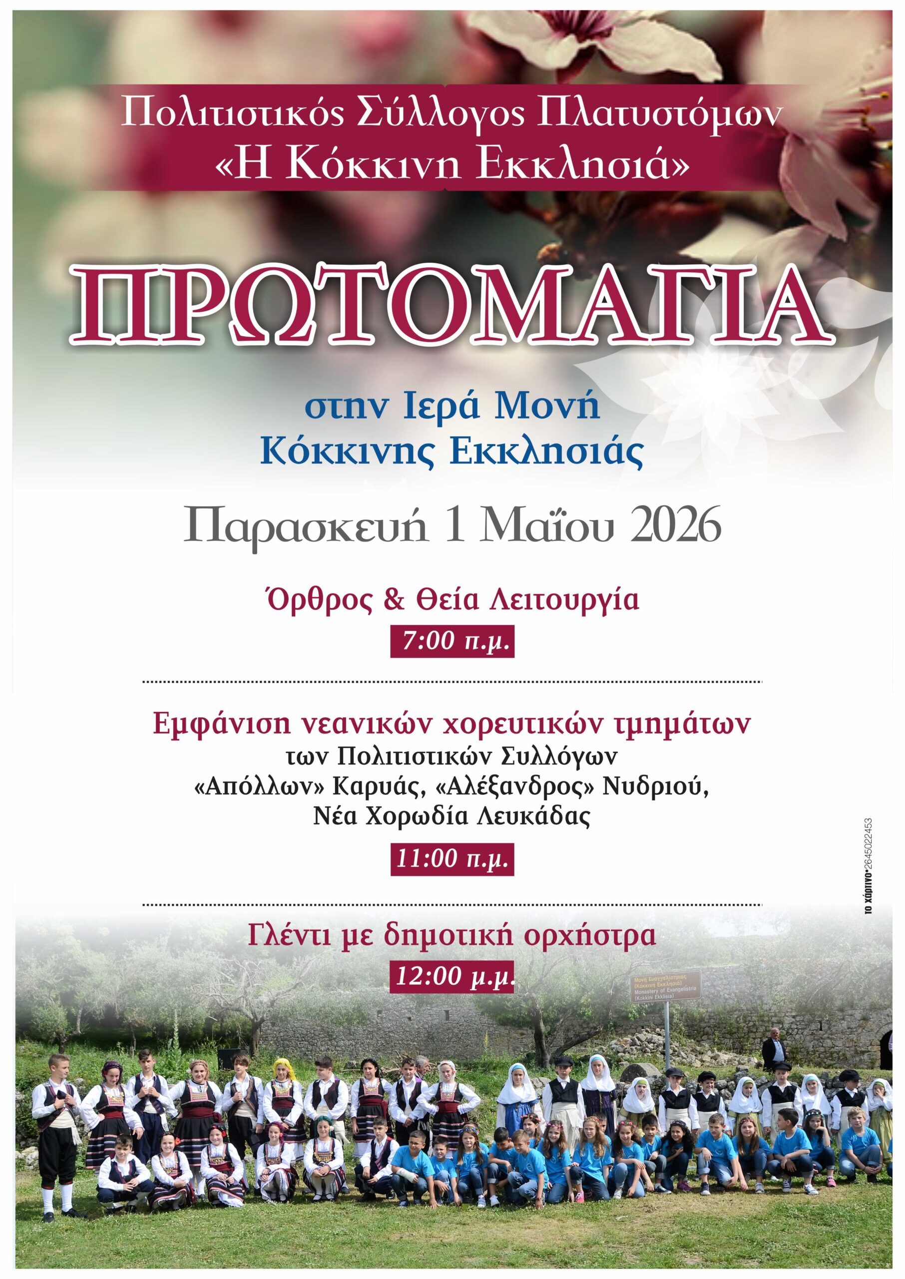 Ο Πολιτιστικός Σύλλογος Πλατυστόμων «Η Κόκκινη Εκκλησιά» σας προσκαλεί στην πρωτομαγιάτικη εορταστική εκδήλωση που διοργανώνει στην Ιερά Μονή Κόκκινης Εκκλησιάς την Παρασκευή 1 Μαΐου 2026.