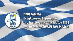 Όπως κάθε χρόνο, έτσι και φέτος, η Περιφερειακή Ενότητα Λευκάδας διοργανώνει, την Παρασκευή 21 Μαΐου 2021, εκδηλώσεις για τον εορτασμό της Ένωσης των Επτανήσων με τη Μητέρα Ελλάδα.