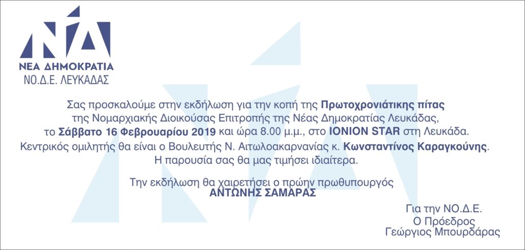 Σήμερα η εκδήλωση κοπής πρωτοχρονιάτικης πίτας της ΝΟΔΕ Λευκάδας στην αίθουσα εκδηλώσεων του “Ιιονιον Σταρ”. Στη Λευκάδα βρίσκεται ήδη ο πρώην πρωθυπουργός και λάτρης πλέον του νησιού μας κος Αντώνης Σαμαράς καθώς και η υποψήφια περιφερειάρχης κα Ρόδη Κράτσα.