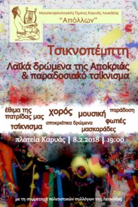 Σας γνωρίζουμε ότι ο Απόλλωνας Καρυάς διοργανώνει την Τσικνοπέμπτη 8 Φεβρουαρίου 2018 και ώρα 19:00 στην κεντρική πλατεία Καρυάς εκδήλωση αφιερωμένη στα αποκριάτικα δρώμενα της πατρίδας μας, κατά τη διάρκεια της οποίας θα πραγματοποιηθεί και παραδοσιακό τσίκνισμα.
