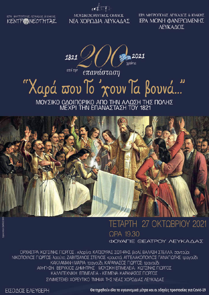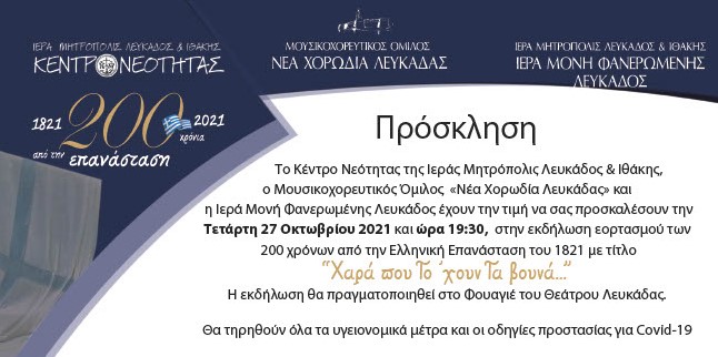 Το Κέντρο Νεότητας της Ιεράς Μητρόπολις Λευκάδος & Ιθάκης, ο Μουσικοχορευτικός Όμιλος «Νέα Χορωδία Λευκάδας» και η Ιερά Μονή Φανερωμένης Λευκάδος διοργανώνουν εκδήλωση εορτασμού των 200 χρόνων από την Ελληνική Επανάσταση του 1821 με τίτλο: