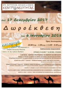 Θα διαρκέσει από την Κυριακή, 17 Δεκεμβρίου 2017 μέχρι και το Σάββατο, 6 Ιανουαρίου 2018, ενώ θα παραμένει ανοιχτή καθημερινά, τα πρωινά από 10.00 π.μ. μέχρι 1.00 μ.μ. και τα απογεύματα από 6.00 μ.μ. μέχρι 8.00 μ.μ.