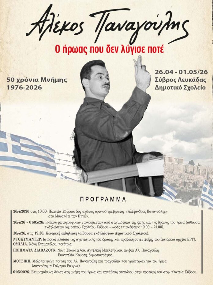 Με αφορμή τη συμπλήρωση 50 χρόνων από τον θάνατο του συγχωριανού μας Αλέξανδρου Παναγούλη το 1976, συνεχίζονται στον Σύβρο Λευκάδας οι εκδηλώσεις μνήμης, αφιερωμένες σε έναν από τους σημαντικότερους αγωνιστές της σύγχρονης ελληνικής ιστορίας.