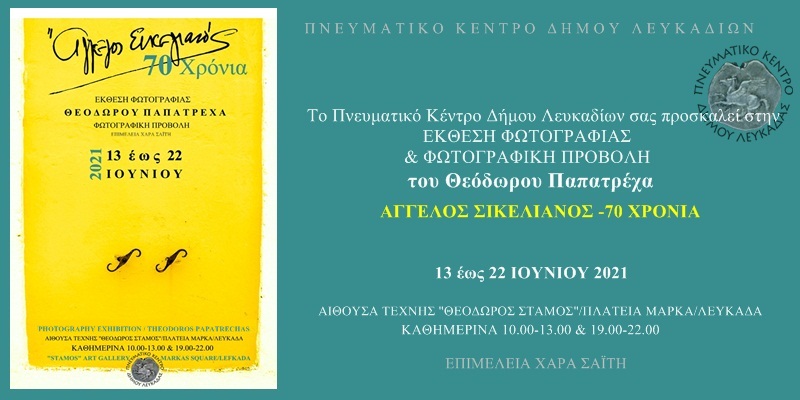Με αφορμή τη συμπλήρωση εβδομήντα χρόνων από τον θάνατο του ποιητή Άγγελου Σικελιανού, το Πνευματικό Κέντρο του Δήμου Λευκαδίων διοργανώνει έκθεση φωτογραφίας και φωτογραφική προβολή του καλλιτέχνη – φωτογράφου Θεοδώρου Παπατρέχα. Η έκθεση θα πραγματοποιηθεί στην αίθουσα τέχνης “Θεόδωρος Στάμος”, στην πλατεία Μαρκά, από τις 13 έως τις 22 Ιουνίου 2021.